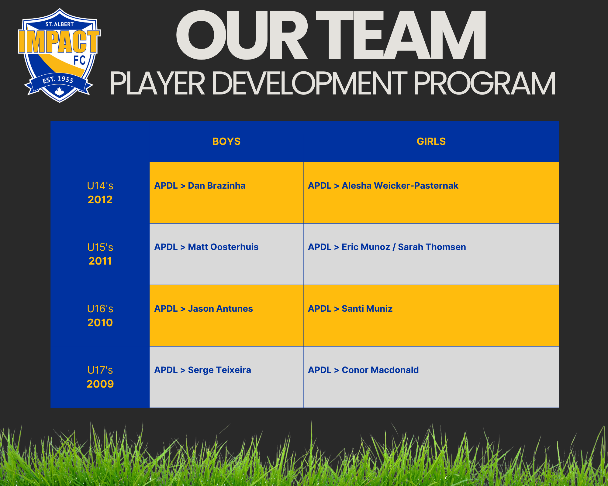 CLUB COACHES 2025 - 26 Impact Coaches Interested in coaching with us? Apply Here For players who are interested in our APDL program please complete the form beside 2026 Player Interest Form 2018 - 2017 Born 2016 - 2015 Born 2014 - 2012 Born APDL Coaches 2009 - 2011 Born Learn More OUR CLUB YOUTH PROGRAMS ADULT PROGRAMS TECHNICAL DEVELOPMENT PROGRAMS APPAREL FAQ REGISTER EMPLOYMENT OPPORTUNITIES Contact Us Phone (780) 884-1054 Office 61 RIEL DRIVE ST. ALBERT, AB T8N 3Z3 Hours of Operation Mon - Thurs, 10:00 - 17:00 Fri - 09:00 - 16:00 Weekends & Statutory Holidays – CLOSED Your name Please enter your name. Your email Please enter a valid email. Your phone Please enter a valid phone number. Your message Please enter a message. Submit Message failed. Please try again. Thanks for your message! We’ll be in touch soon.
