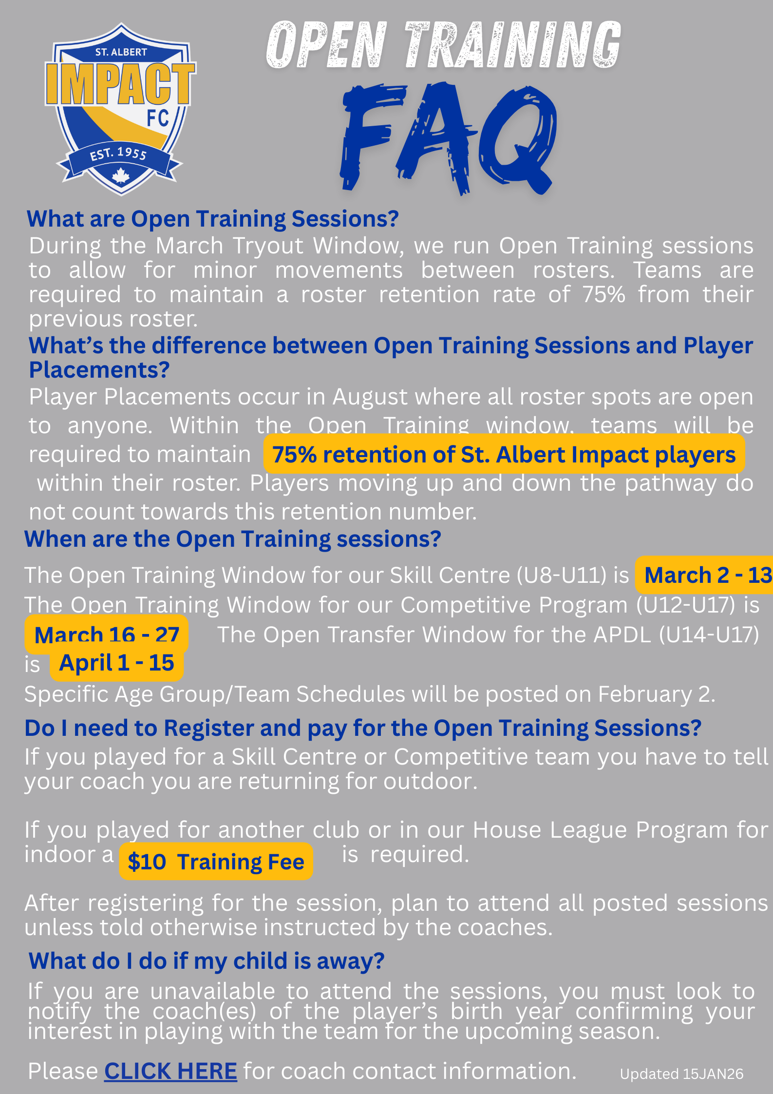All sessions are scheduled to take place at 61 Riel Drive. Check the board prior to arrival to see which field your session is scheduled to be on. All Impact players who registered and played indoor, the sessions are free to attend. If you played for another club, there is a $10 training fee. Registration must be completed prior to stepping onto the field.